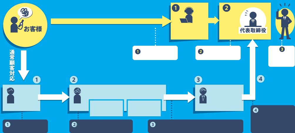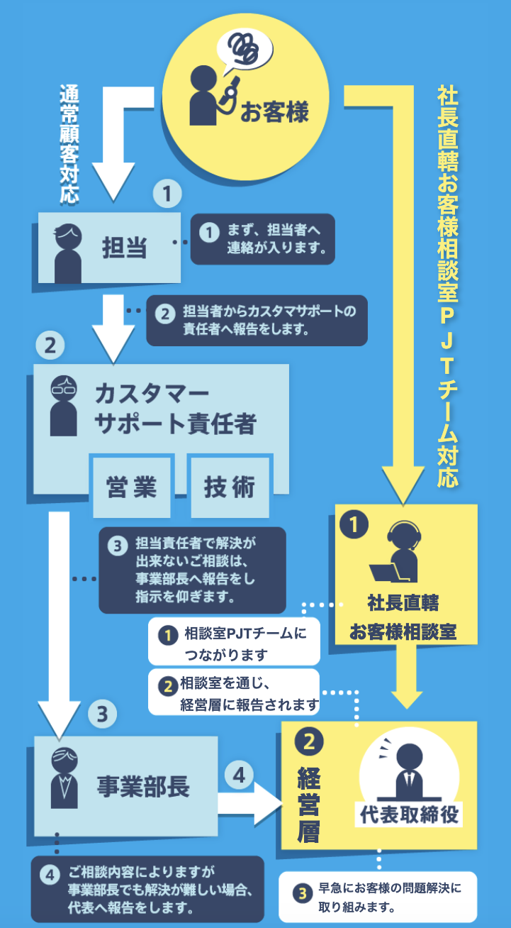 社長直轄お客様相談室は、カスタマーサポートとは違い、担当者レベルでは進みづらい案件や、経営層に伝えたい案件などを直接伝えることのできる窓口です。