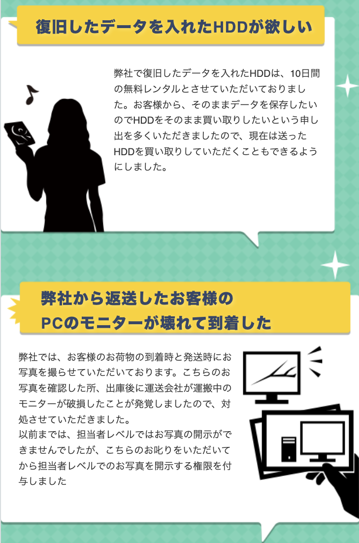 弊社で復旧したデータを入れたHDDは、10日間の無料レンタルとさせていただいておりました。お客様から、そのままデータを保存したいのでHDDをそのまま買い取りしたいという申し出を多くいただきましたので、現在はレンタル用のHDDを買い取りしていただくこともできるようにしました。