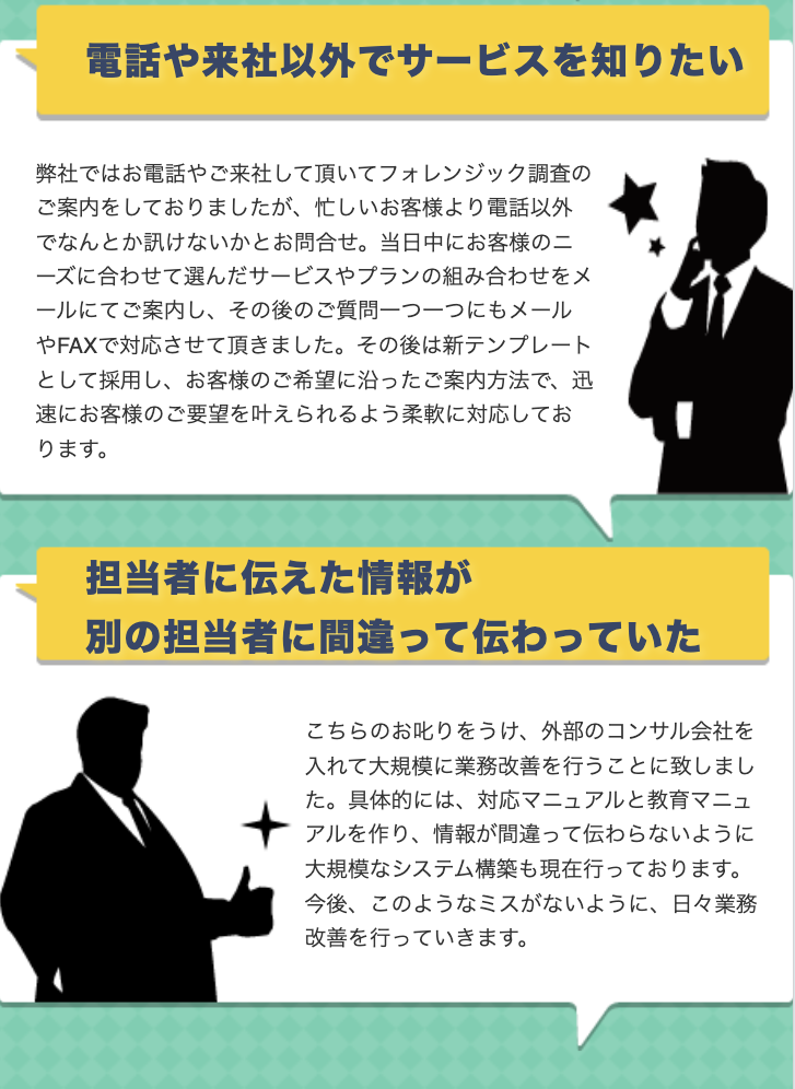 弊社ではお電話やご来社して頂いてフォレンジック調査のご案内をしておりましたが、忙しいお客様より電話以外でなんとか案内できないかとお問合せ。当日中にお客様のニーズに合わせて選んだサービスやプランの組み合わせをメールにてご案内し、その後のご質問一つ一つにもメールやFAXで対応させて頂きました。その後はご案内方法の一つとして採用し、お客様のご希望に沿ったご案内方法で、迅速にお客様のご要望を叶えられるよう柔軟に対応しております。
